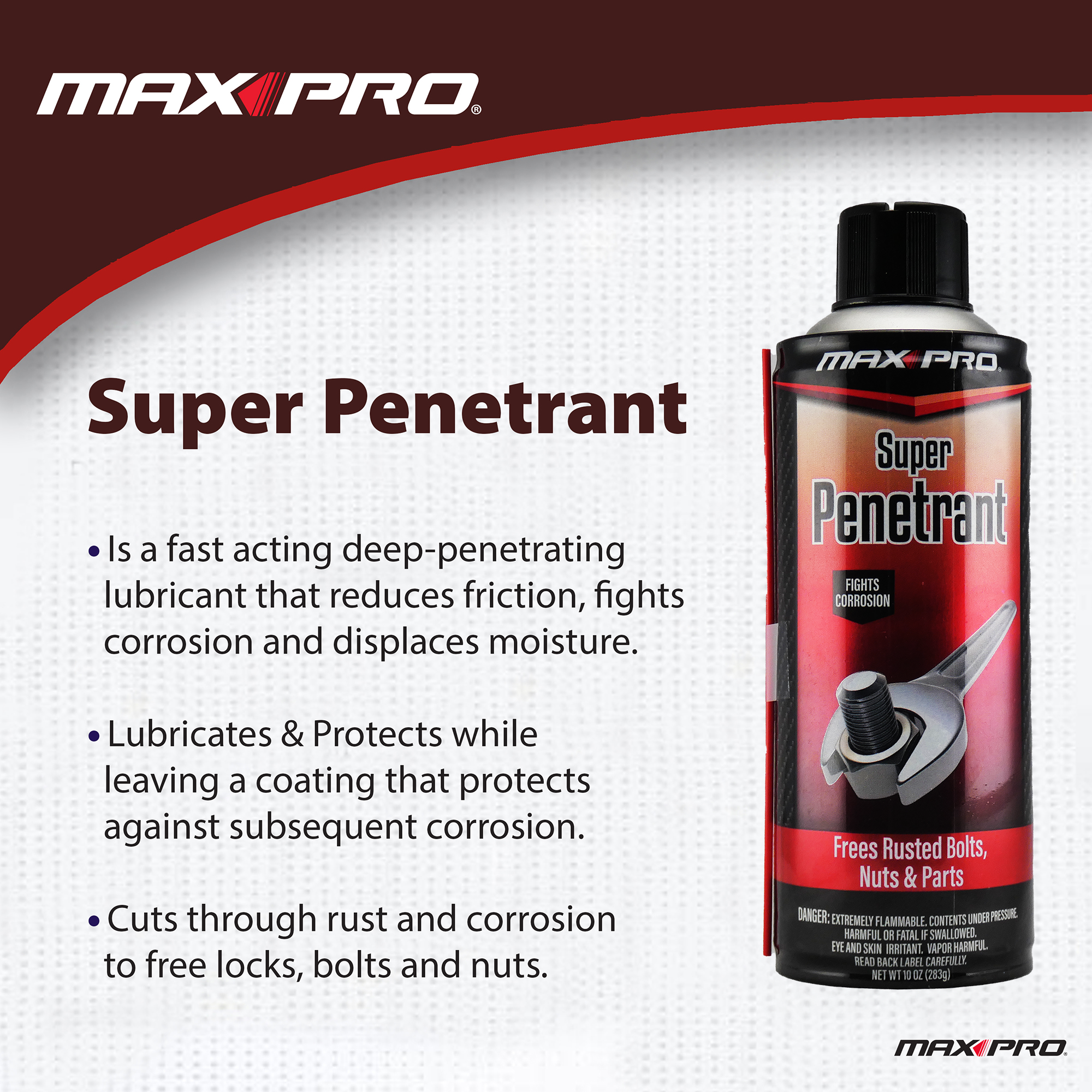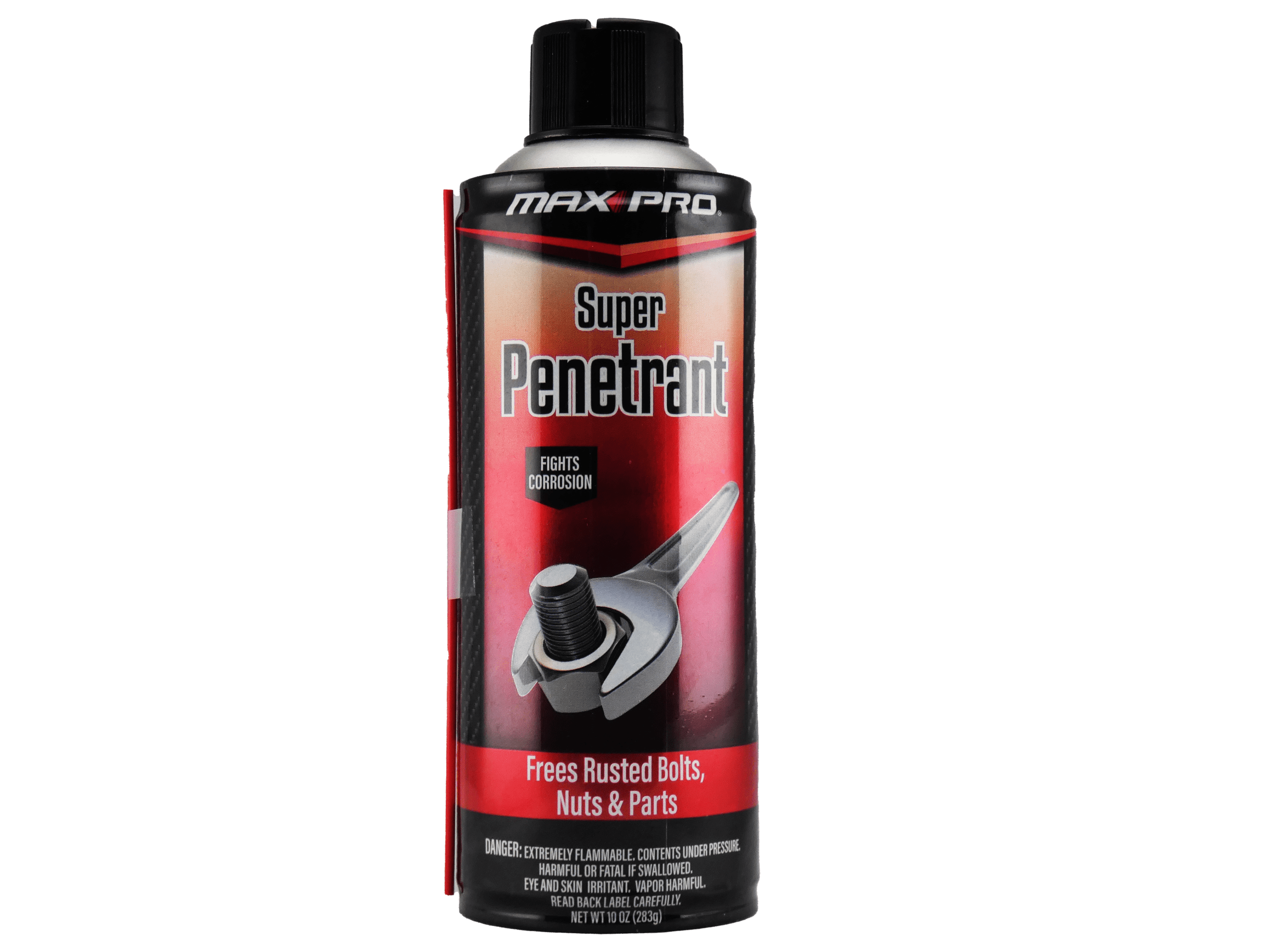 Max Pro® Super Penetrant is a fast acting deep penetrating lubricant that reduces friction, fights corrosion and displaces moisture. Removes dirt and grease while leaving a coating that protects against subsequent corrosion. Cuts through rust and corrosion to free locks, bolts and nuts.